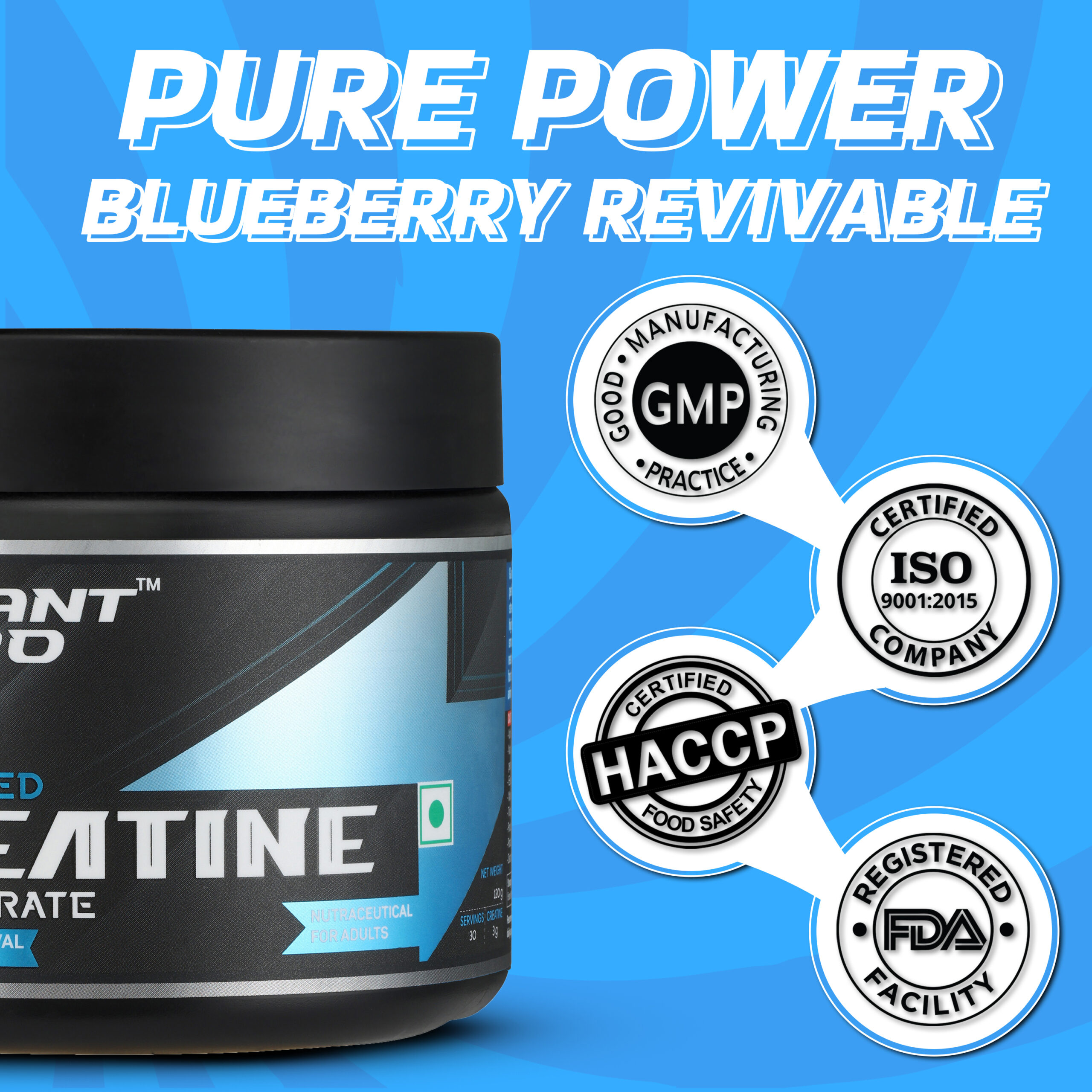Ingredients: 100% Micronised Creatine Monohydrate, Blueberry Flavour